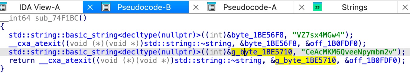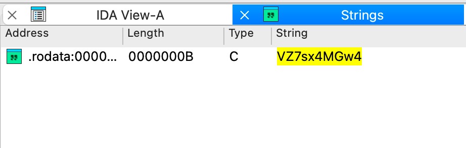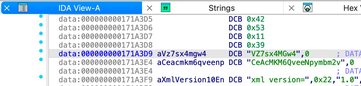 把 libcocos2djs.so 拖入 IDA 工具静态分析,点击 View->Open Subviews->Strings,搜索VZ7sx4MGw4,如果能够搜到就最简单,双击VZ7sx4MGw4进入 Hex View 页面能看到 Key(CeAcMKM6QveeNpymbm2v) 就在附近。