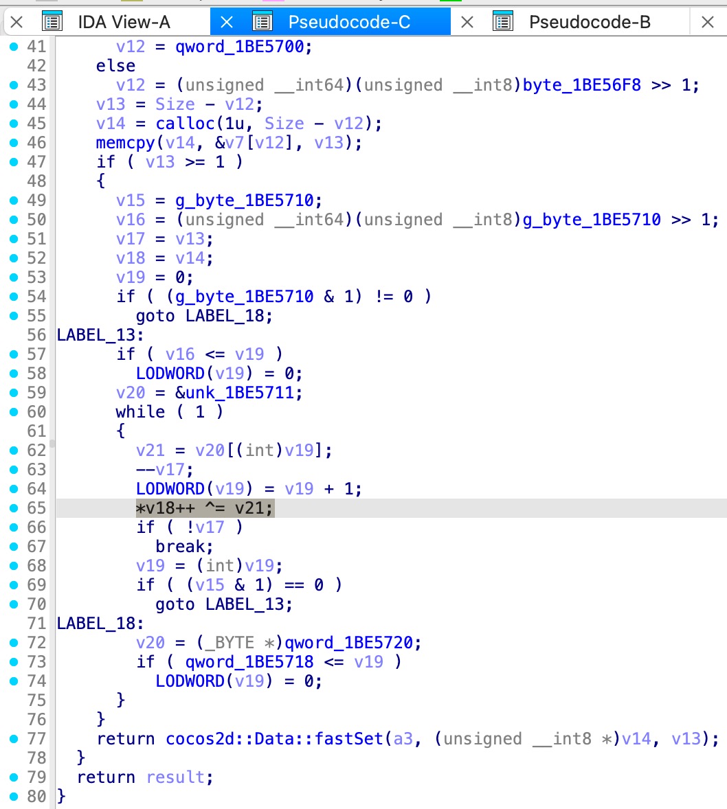 顺着这个 Key 的交叉引用一路跟进,可以定位到 getDataFromFile 函数,发现以下这段代码基本确定是 XOR 算法。